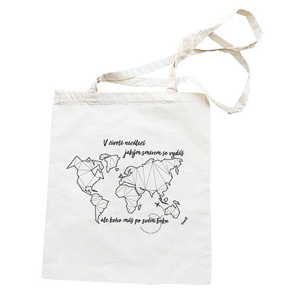 Torba płócienna z oryginalnym obrazkiem mapy świata i napisem W życiu nie liczy się, w jakim kierunku się wybierasz, ale kogo masz przy swoim boku. Oszczędzaj przyrodę i nie chcesz używać plastikowych toreb, które obciążają środowisko naturalne? Torba materiałowa z nietypowym nadrukiem jest tym prawdziwym rozwiązaniem. Torba płócienna z długim uchwytem.