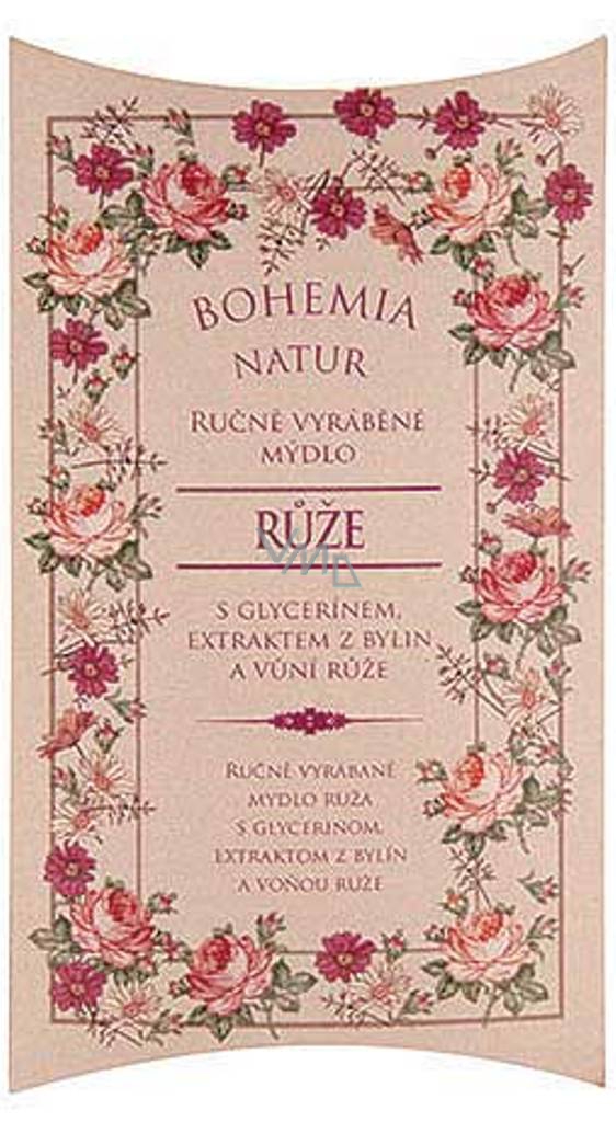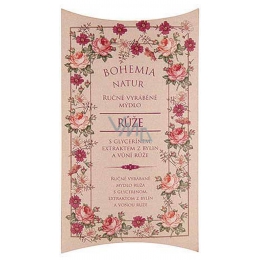 Bohemia Natur ręcznie wytwarzane mydło toaletowe w papierowym opakowaniu z gliceryną, ekstraktem z zioł i różą. Delikatne kremowe mydło toaletowe z gliceryną i ekstraktami rumianku prawdziwego (Chamomilla recutita L.), nagietka lekarskiego (Calendula officinalis L.), szałwii lekarskiej (Salvia officinalis L.), pokrywów dwuwklęsłych (Urtica dioica L.) i brzozy białej (Betula alba L). Myje delikatnie i skutecznie skórę całego ciała bez jej nadmiernego wysuszania.