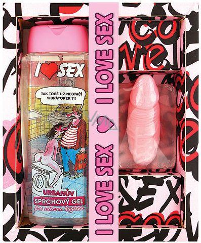 Sexy dárek pro ženu I love Sex. Obrázek na etiketu sprchového gelu vytvořil známý kreslíř Petr Urban.