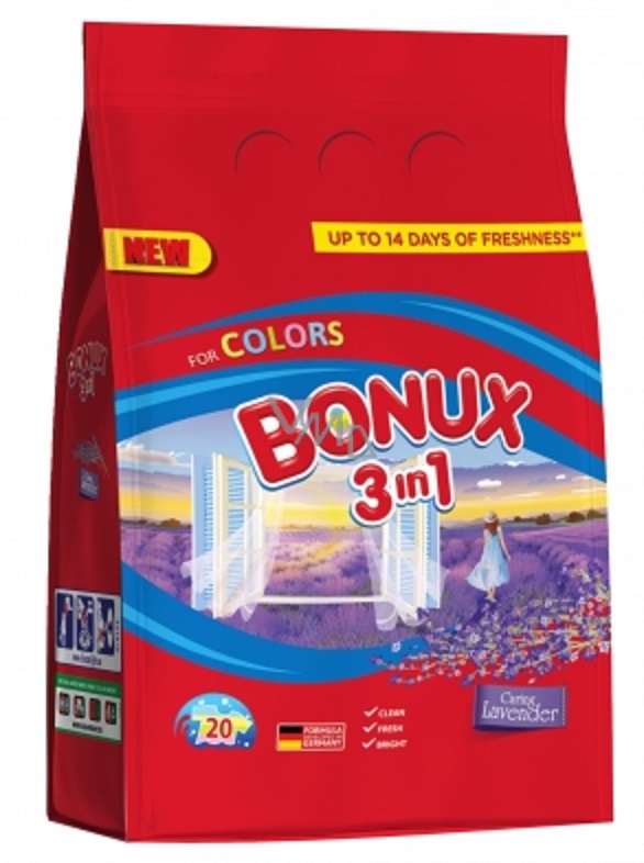Bonux do kolorowego prania z wońą lawendy i jego formuła 3w1 pomoże Wam w wymagającym praniu dla całej rodziny. Zapewnia Twoim ubraniom długotrwałą świeżość. Nie nadaje się do wełny i jedwabiu. Doskonale usuwa plamy, nadaje praniu świeżość i nie jest drogi. Inteligentna formuła z trzema zaletami w jednym opakowaniu od Bonuxu! Cała rodzina może być zadowolona!