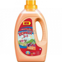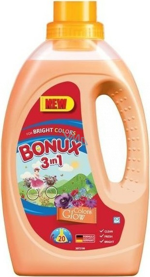 Bonux 3v1 gel 20 pracích dávek Colors Glow 1,1 l pro barevné prádlo s příjemnou vůní pro všechny typy praček i na ruční praní. Německá receptura důkladně odstraňuje skvrny, ochraňuje barvu prádla a zanechává příjemnou vůni po dlouhou dobu. Ochraňuje vlákna vašeho prádla. Účinná teplota praní: od 20°C do 60°C. Prádlo je zářivě čisté a provoněné příjemnou vůní.