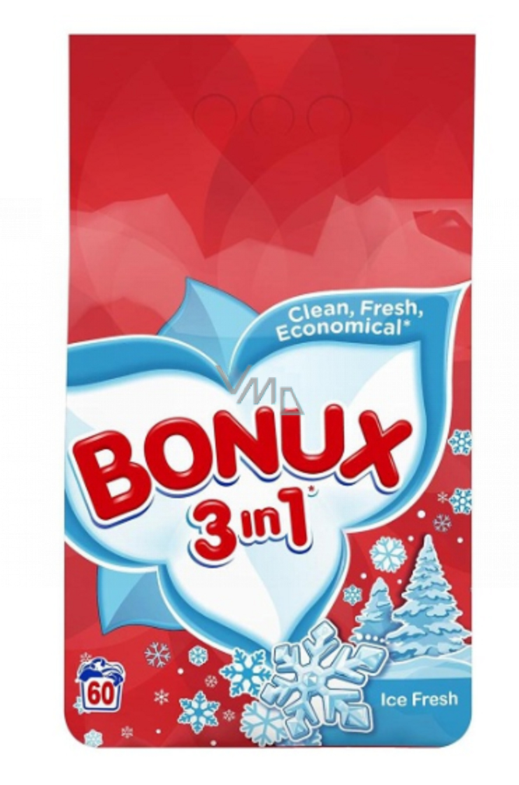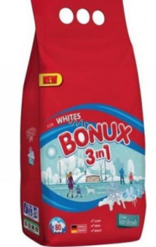 Bonux 3w1 z unikalnym świeżym zapachem jest przeznaczony do białych tkanin. Proszek do prania Bonux White Polar Ice Fresh to inteligentny wybór w fantastycznej cenie. Otrzymasz dobrą siłę prania i świeżość, jaką byś oczekiwał tylko od tych najlepszych i najdroższych środków do prania. Zawiera aktywne cząsteczki do doskonałego prania i formułę zapobiegającą osadzaniu się kamienia, możesz prać w temperaturach od 30 °C. Nie używać na wełnę i jedwab.