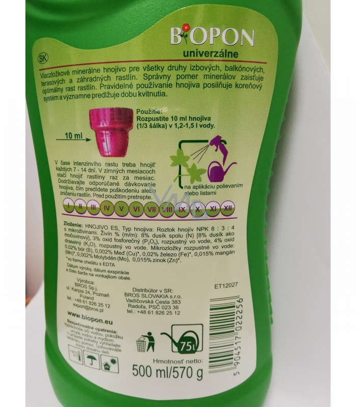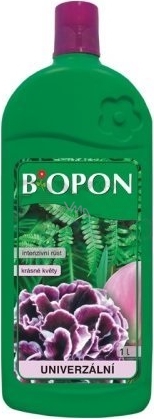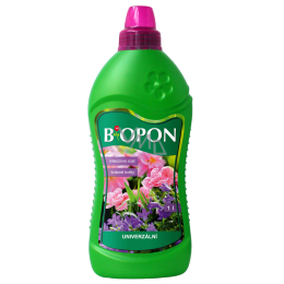 Biopon Uniwersalne wieloskładnikowe nawozy mineralne przeznaczone dla wszystkich rodzajów roślin pokojowych, balkonowych, tarasowych i ogrodowych do aplikacji na liście i do gleby. Odpowiednio dobrane dawki azotu, fosforu i potasu zapewniają optymalny wzrost i kwitnienie roślin. Do aplikacji przez podlewanie lub na liście.