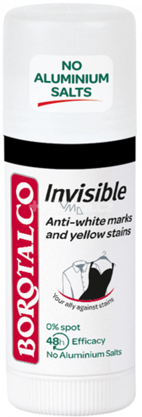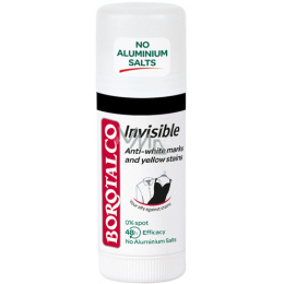 Borotalco Invisible byl vyvinut speciálně za účelem redukce vzniku žlutých skvrn na světlých látkách a bílých stop na tmavých látkách. Díky svému složení s obsahem Microtalca, pohlcujícím pot, reguluje deodorant pocení a denně zajišťuje suchou pokožku.Invisible Stick neobsahuje ŽÁDNÉ hliníkové soli.