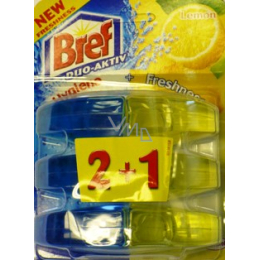 Dzięki opatentowanej technologii podwójnej komory Bref Duo Aktywny toaleta jest jednocześnie czyszczona i odświeżana przy każdym spłukaniu. Lewa komora bloku WC kryje ulepszony niebieski płynny środek czyszczący do WC z jeszcze aktywniejszym składem, który uwalnia się przy każdym spłukaniu do muszli toaletowej, gdzie usuwa zanieczyszczenia i kamień wodny. Z prawej komory jednocześnie uwalnia się intensywny, długotrwały zapach z większą zawartością składnika zapachowego, dzięki czemu całe Twoje WC jest doskonale czyste i pachnące.