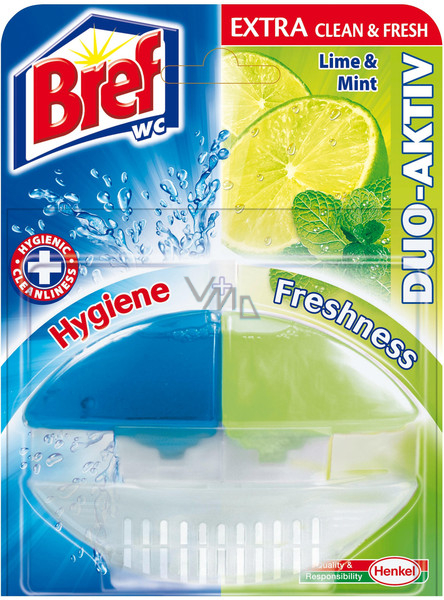 Díky patentované dvoukomorové technologii Bref Duo Aktiv se toaleta při každém spláchnutí zároveň čistí i osvěžuje. Levá komora WC bloku skrývá vylepšený modrý tekutý WC čistič s ještě aktivnějším složením, který se uvolňuje s každým spláchnutím do toaletní mísy, kde odstraňuje nečistoty a vodní kámen. Z pravé komory se zároveň uvolní intenzivní, dlouhotrvající vůně s větším obsahem parfémové složky, takže celá vaše toaleta je dokonale čistá a provoněná.