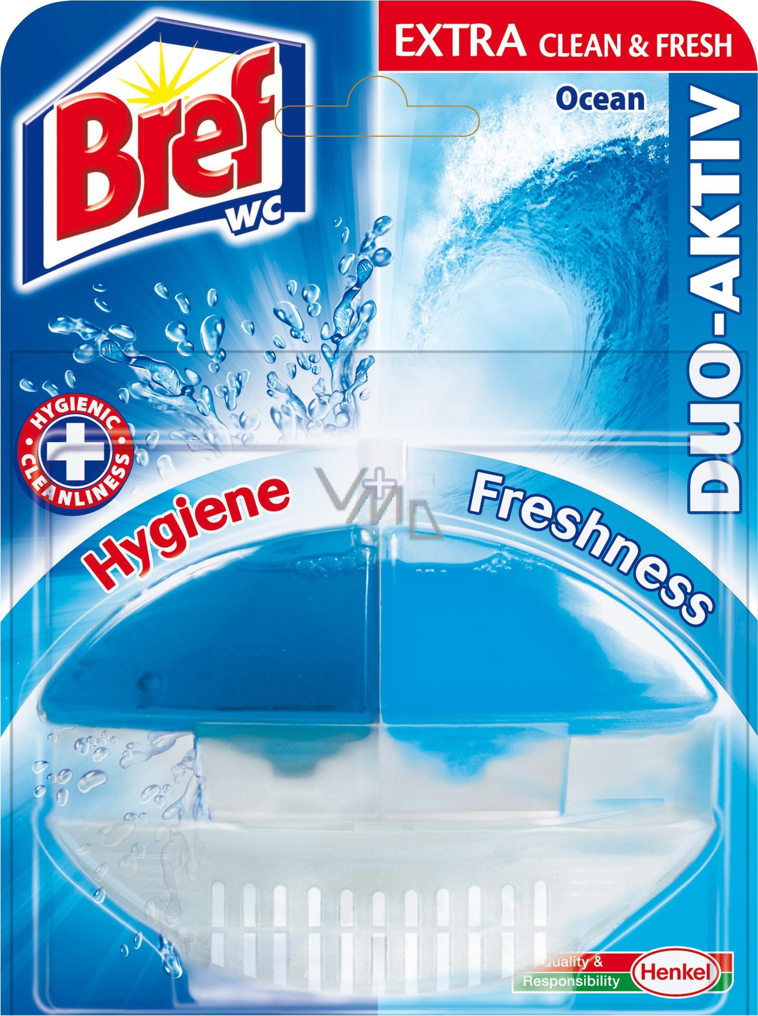 Díky patentované dvoukomorové technologii Bref Duo Aktiv se toaleta při každém spláchnutí zároveň čistí i osvěžuje. Levá komora WC bloku skrývá vylepšený modrý tekutý WC čistič s ještě aktivnějším složením, který se uvolňuje s každým spláchnutím do toaletní mísy, kde odstraňuje nečistoty a vodní kámen. Z pravé komory se zároveň uvolní intenzivní, dlouhotrvající vůně s větším obsahem parfémové složky, takže celá vaše toaleta je dokonale čistá a provoněná.