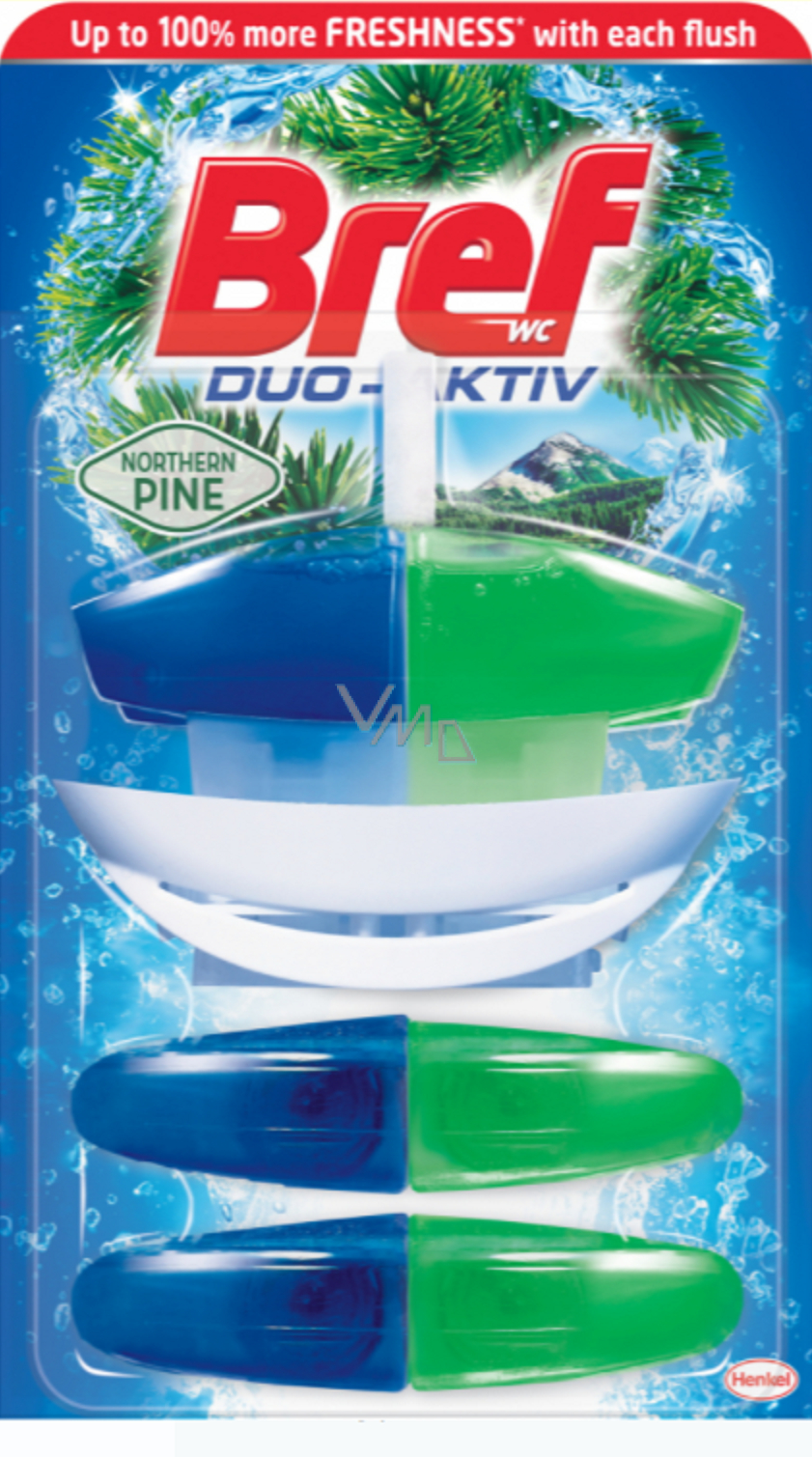 Bref Duo-Aktiv = Higieniczny środek czyszczący + długo utrzymujący się świeży zapach. Połączenie intensywnego, długo utrzymującego się zapachu i higienicznej czystości z każdym spłukiwaniem. Lewa komora bloku WC kryje ulepszony niebieski płynny środek czyszczący do toalety z jeszcze aktywniejszym składem, który uwalnia się z każdym spłukiwaniem do muszli klozetowej, gdzie usuwa zanieczyszczenia i kamień wodny. Z prawej komory jednocześnie uwalnia się intensywny, długo utrzymujący się zapach z większą zawartością składnika zapachowego, dzięki czemu cała twoja toaleta jest doskonale czysta i pachnąca.