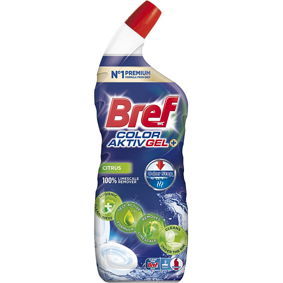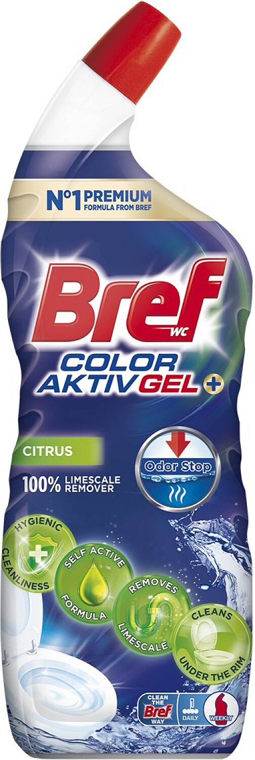Bref Excellence Gel Color Aktiv + jest idealny do doskonałych, lśniących i świeżych rezultatów czyszczenia. Bref WC żel środek czyszczący do toalety usuwa kamień wodny, zabrudzenia i plamy z krawędzi toalety i muszli klozetowej. Dzięki swojemu aktywnemu składowi, Bref Excellence Gel jest skuteczny przeciwko najczęstszym problemom przy czyszczeniu WC i oferuje łatwe, higieniczne głębokie czyszczenie bez śladów kamienia wodnego i zabrudzeń. Może być używany jako codzienny środek czyszczący do każdej powierzchni i kształtu toalety. Dla przyjemniejszego czyszczenia i dotyku świeżości w całej toalecie, Bref Excellence zapewnia również świeży cytrusowy zapach.