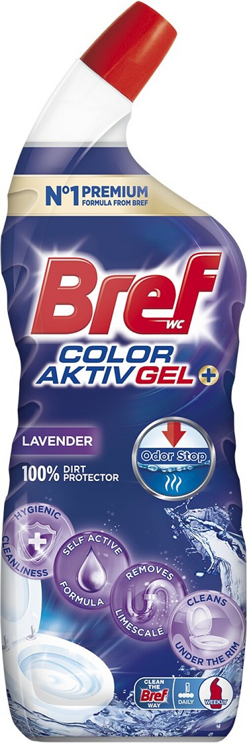 Bref Excellence Gel Color Aktiv + jest perfekcyjny dla doskonałych, lśniących i świeżych rezultatów czyszczenia. Bref WC żel środek czyszczący do toalety usuwa kamień, brud i plamy z krawędzi toalety i misy klozetowej. Dzięki swojemu aktywnemu składowi, Bref Excellence Gel jest skuteczny przeciwko najczęstszym problemom podczas czyszczenia toalety i oferuje łatwe, higieniczne dogłębne czyszczenie bez śladów kamienia i brudu. Może być używany jako codzienny środek czyszczący do każdego rodzaju powierzchni i kształtu toalety. Aby ułatwić czyszczenie i dodać świeżości w całej toalecie, Bref Excellence oferuje także świeży zapach lawendy.
