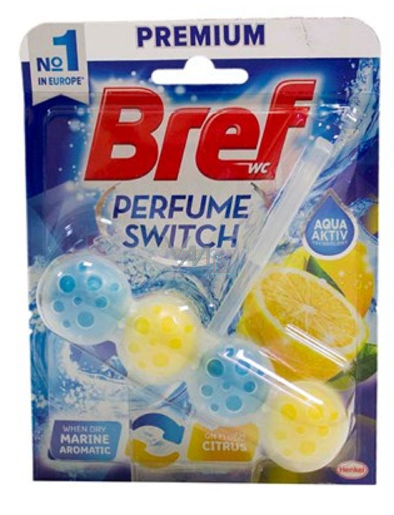 WC blok BREF Perfume Switch Marine Aromatic - Citrus představuje inovativní způsob údržby vaší toalety. WC blok je vybaven čtyřmi kuličkami, přičemž každá z nich má specifické složení pro dokonalý výsledek. Při každém spláchnutí bude vaše toaleta hygienicky čistá, svěží, bez bakterií a navíc bude vonět po každém použití jinou intenzivní vůní. V suchém stavu bude toaleta vonět mořem, naopak při spláchnutí ucítíte osvěžující vůni citrusů. WC blok zaručí vůni od prvního do posledního spláchnutí.