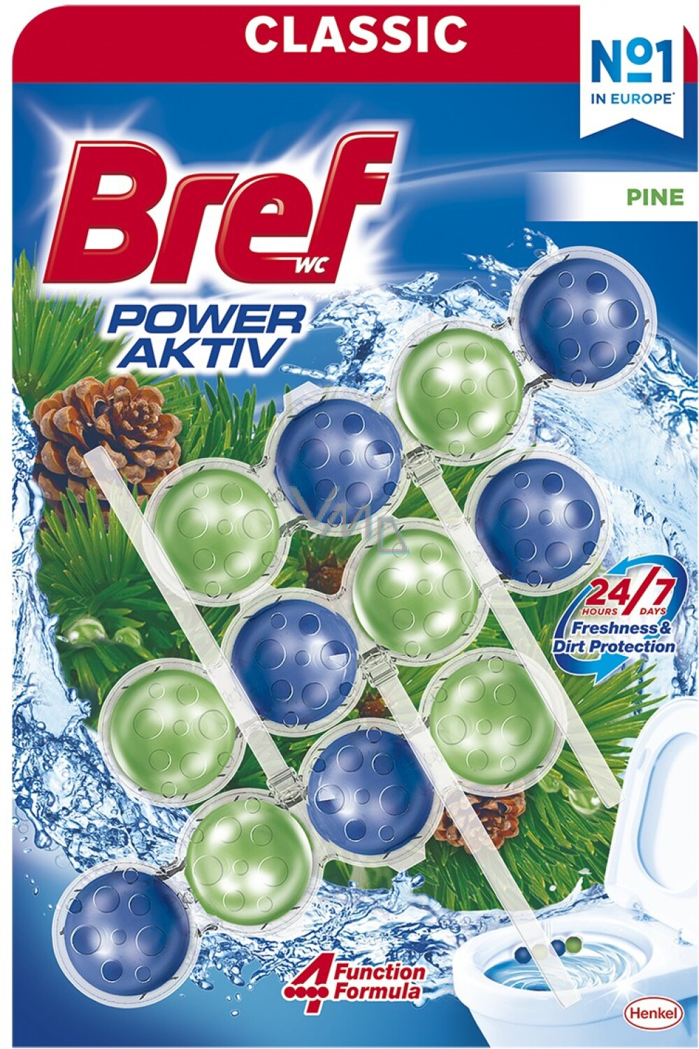 Bref Power Aktiv WC blok o zapachu sosny i o + 50 % wyższym działaniu przeciwko kamieniu wodnemu (Po kilku spłukaniach w porównaniu do niepodespanego powierzchni toalety.)