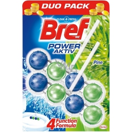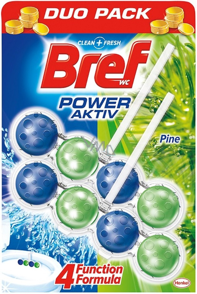 Bref Power Aktiv: je složen ze 4 kuliček uložených v průhledném nerozebíratelném košíku, které jako jeden tým zvládnou více funkcí při každém spláchnutí - hygienickou čistotu, příjemnou vůni, odstranění usazenin a vytvoření bohaté pěny pro lesk a bělost toalety.