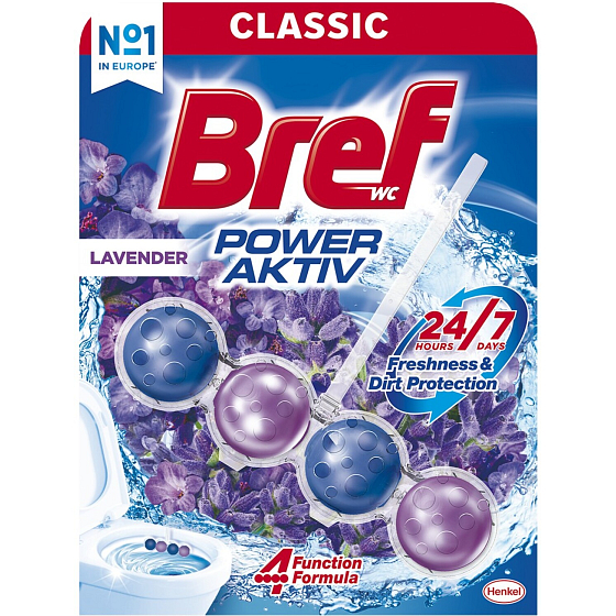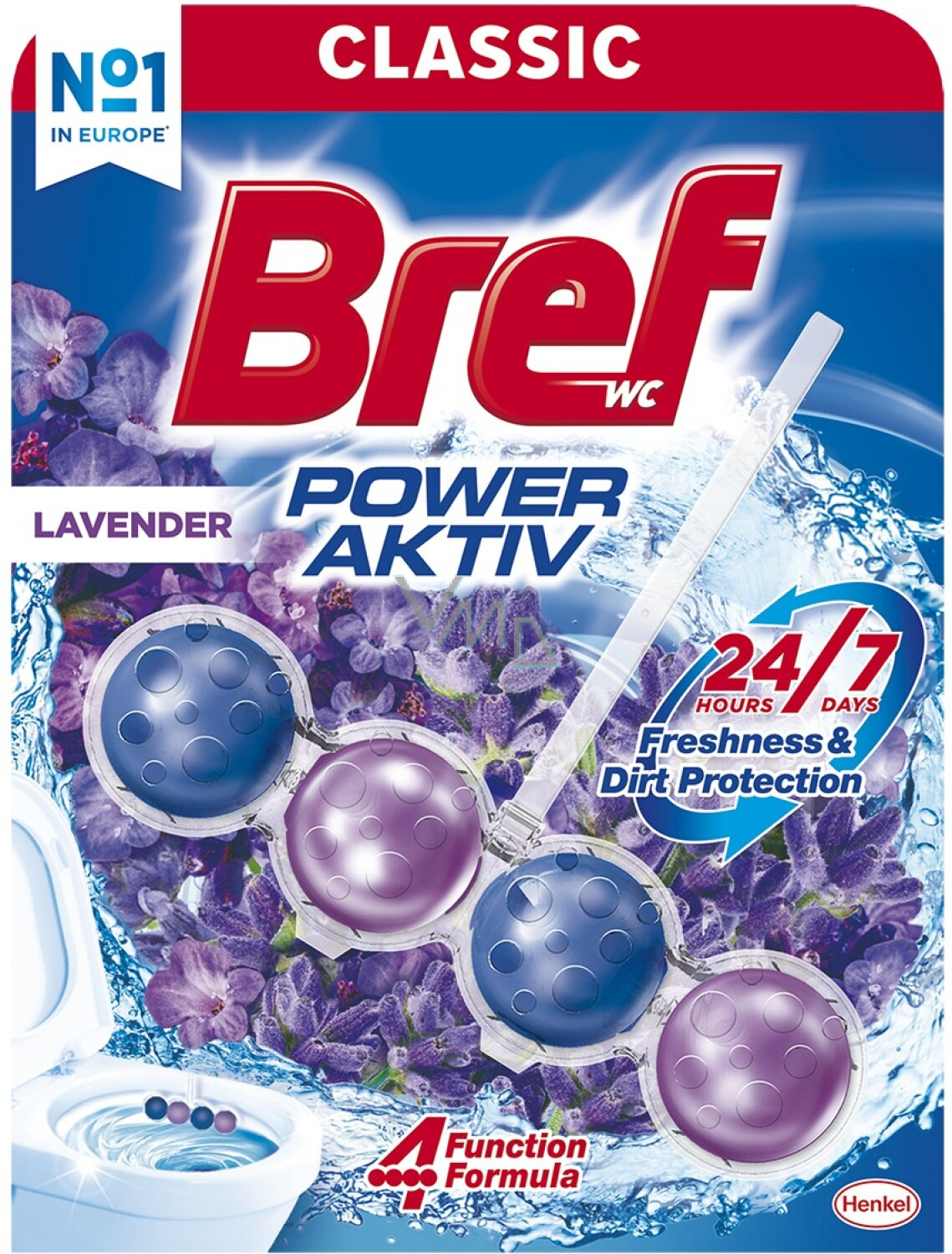 BREF Power Activ to pierwszy blok WC z czterema aktywnymi kulkami, które łączą w sobie atrakcyjny design z doskonałymi właściwościami, aby osiągnąć higienicznie czystą i świeżą toaletę. Dzięki 4 funkcjom, obejmującym pianę czyszczącą, ochronę przed kamieniem wodnym, ochronę przed zabrudzeniami oraz dodatkową świeżość, czyści BREF Power Activ Twoją toaletę przy każdym spłukaniu. Wytrzymuje do 250 spłukań.