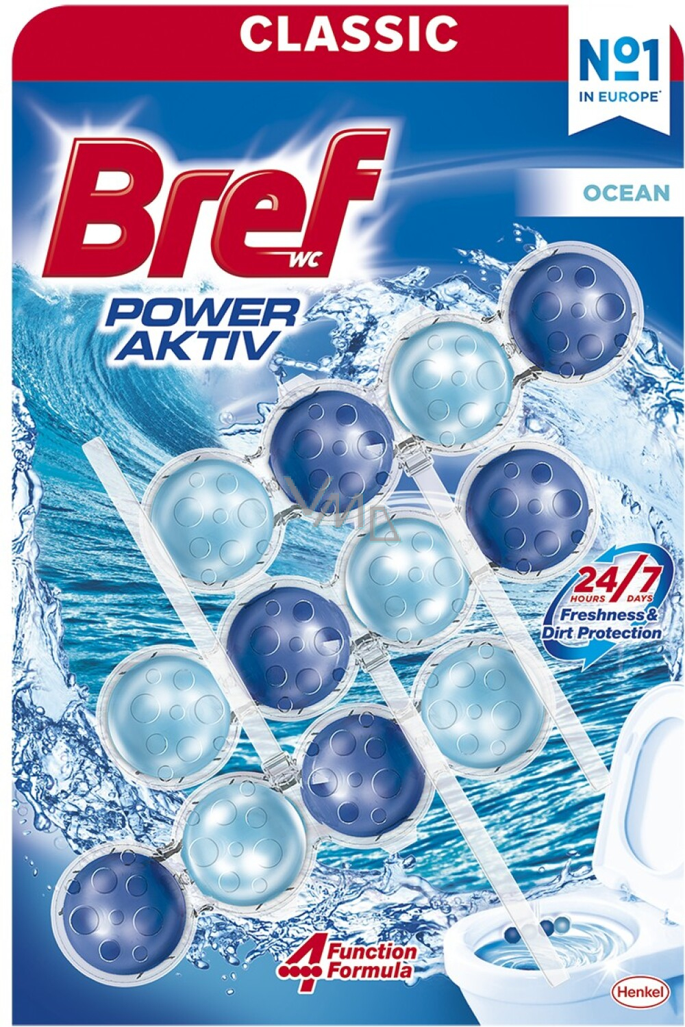 Blok WC Bref Power Aktiv Ocean - innowacyjny sposób na utrzymanie twojej toalety. Blok WC jest wyposażony w cztery kulki, z których każda ma specyficzny skład dla doskonałego rezultatu. Przy każdym spłukaniu twoja toaleta będzie świeża i higienicznie czysta.