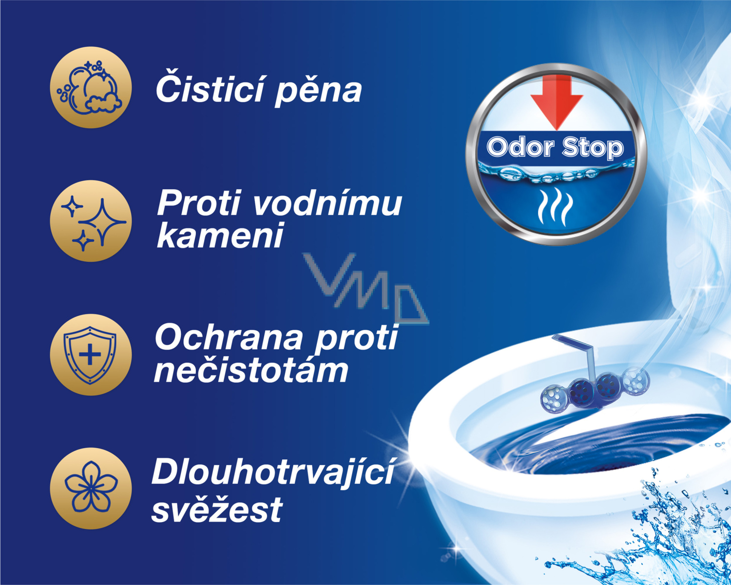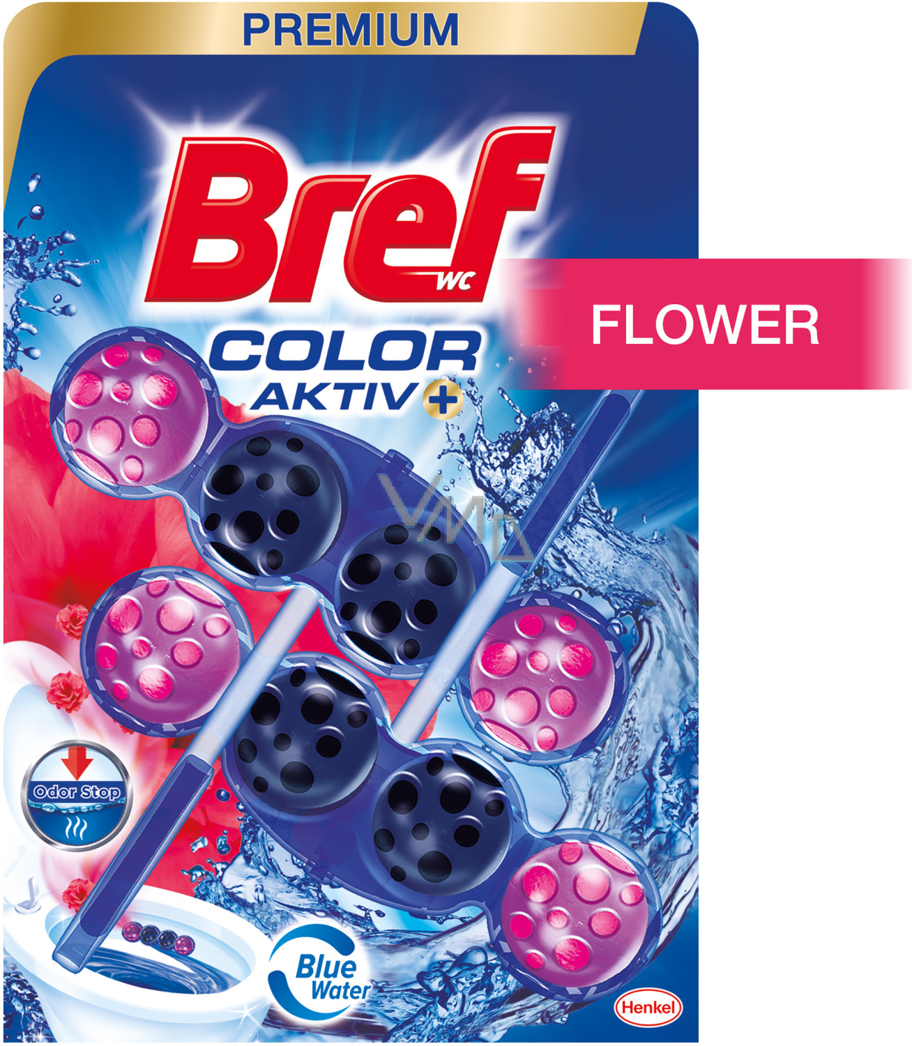 Widoczne czyszczenie jest zapewnione przez wodę zabarwioną na niebiesko, a twoją toaletę wypełni długotrwały zapach kwiatów. Bref Color Aktiv WC blok ma skład z 4 funkcjami.