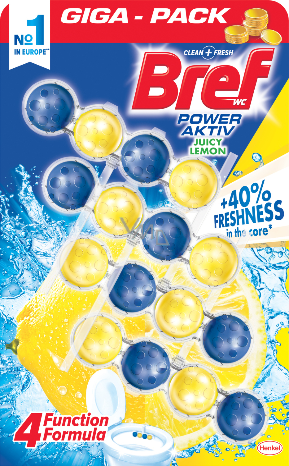 Bref Power Aktiv jest skutecznym twardym blokiem WC, który przy każdym spłukaniu wykonuje 4 funkcje - higieniczną czystość, ochronę przed kamieniem wodnym, długotrwałą świeżość oraz tworzenie bogatej piany czyszczącej dla bieli i blasku toalety. Bref Power Aktiv ma ponadto nowoczesny i praktyczny kształt - koszyczek z kuleczkami jest wystarczająco długi i pokryje większą część muszli WC.