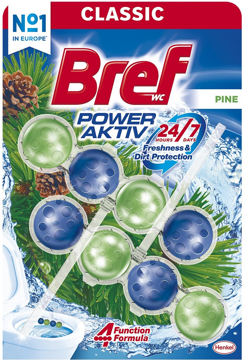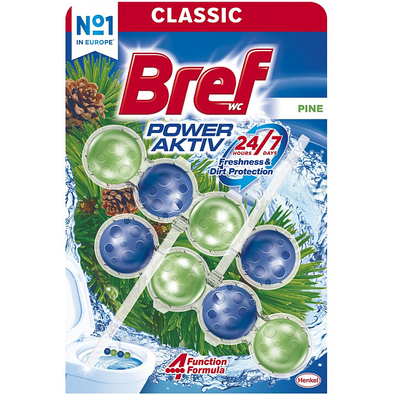 Bref Power Aktiv blok WC z aromatem sosny i o + 50 % wyższa skuteczność przeciwko osadom (Po kilku spłukaniach w porównaniu z nieoczyszczoną powierzchnią toalety.)