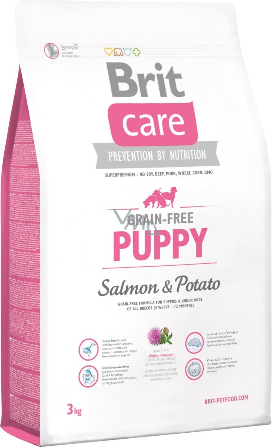 Dopřejte svému pejskovi superprémiové krmivo, které neobsahuje alergenní obiloviny, dodá mu všechny potřebné živiny a přitom nebude zatěžovat jeho citlivý zažívací trakt. Receptura Brit Care Grain-free Puppy Salmon & Potato je 100% hypoalergenní a respektuje tak potřeby i nutričně nejnáročnějších pejsků. Toto krmivo, jehož základ tvoří losos a brambory doplněné řadou funkčních komponent, je vysoce snášenlivé a zamezuje vzniku alergických reakcí i potravinových intolerancí. Zároveň posiluje imunitu vašeho čtyřnohého miláčka a pomáhá eliminovat vznik běžných onemocnění. Brit Care Grain-free Puppy Salmon & Potato je tak bezkonkurenčním krmivem pro nutričně náročná štěňata a mladé psy ve věku od 4 týdnů do 12 měsíců.