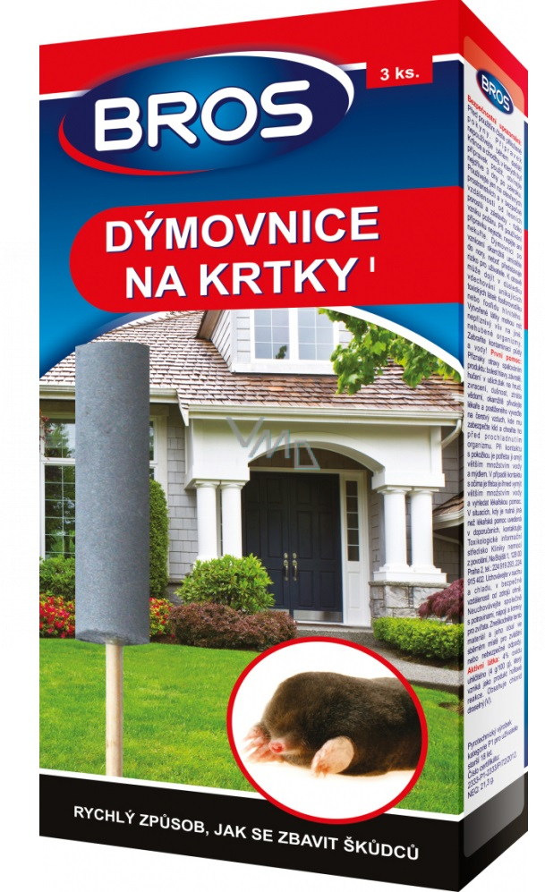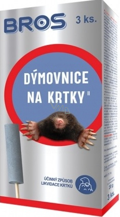 BROS dýmovnice patrona na odpuzuje krtky z travnatých letištních ploch, pozemních vodohospodářských staveb a sportovišť. Je určená pro vypuzení krtků a hrabošů z nežádoucích míst jako jsou např. areály letišť, pozemních hydrotechnických konstrukcí a sportovních objektů, zahrad apod. Aplikuje se výhradně do jejich děr. BROS dýmovnice na krtky účinkuje až 14 dní od použití. Tento biocidní přípravek není přípravkem na ochranu rostlin.