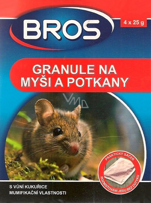 Pelety pro likvidaci myší uvnitř budov a likvidaci potkanů uvnitř i v okolí budov. Obsahují návnadu, která silně láká hlodavce a účinkuje již po prvním použití. Účinek zpožděný několik dní zabraňuje hlodavcům spojovat jed s eliminací jedinců. Výrobek má mumifikující účinek a obsahuje látku, která zabraňuje náhodnému požití osob a zvířat. Výjimečně atraktivní pro hlodavce díky vůni zrn.