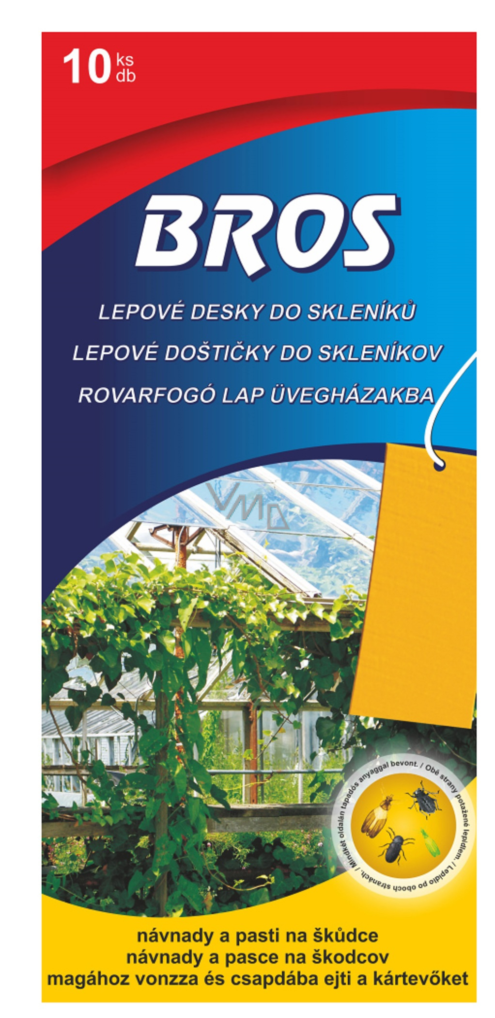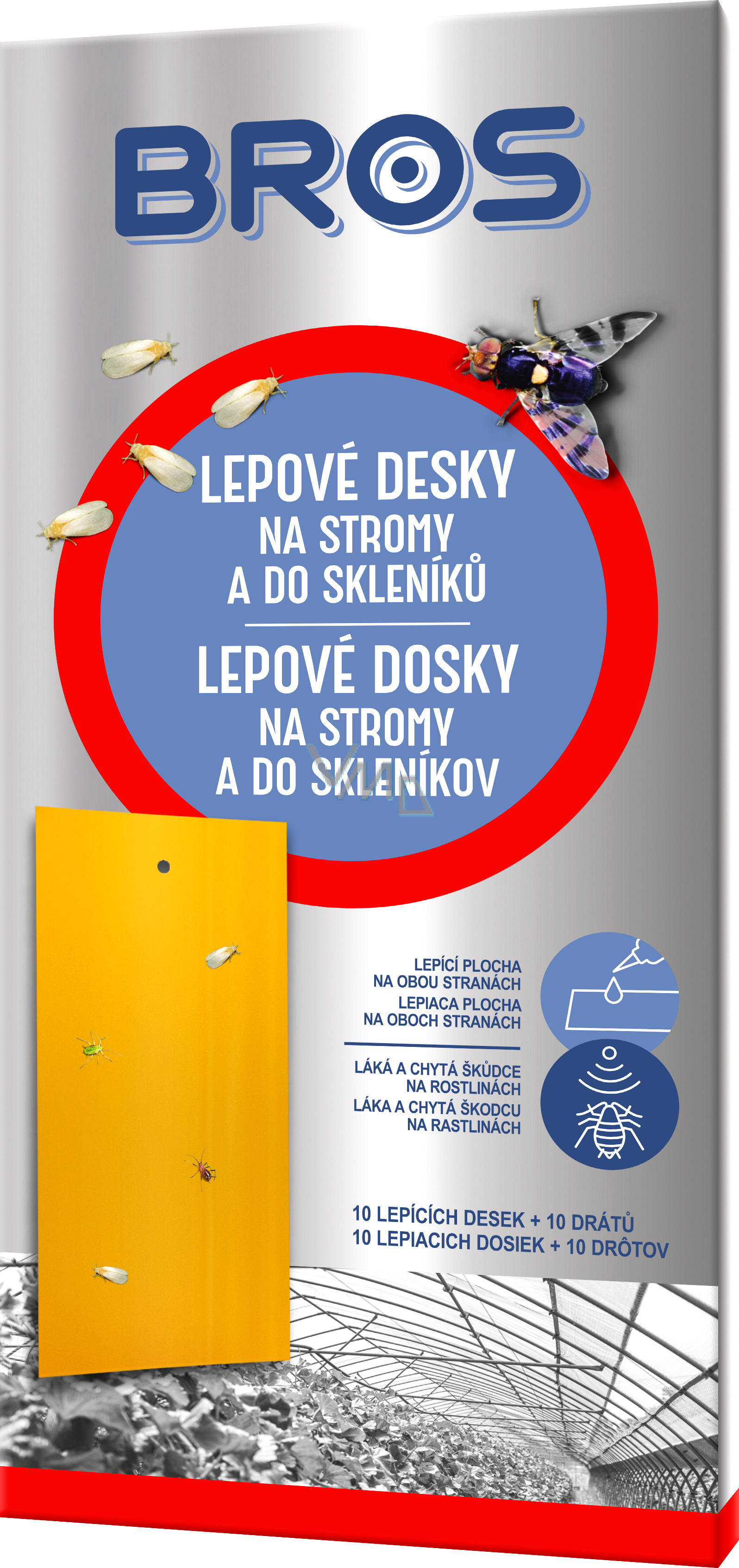 Žluté oboustranné lepové desky na zahradu a do skleníku pro chytání mšic, molic, třásnokřídlého hmyzu, octomilek, obaleče jablečného, podkopníčka ovocného a dalších škůdců. Vábí škůdce na svou žlutou barvu připomínající výraznou barvu květů. Tato lepová deska tak umožňuje sledování přítomnosti škůdců a brání jejich dalšímu rozmnožování.