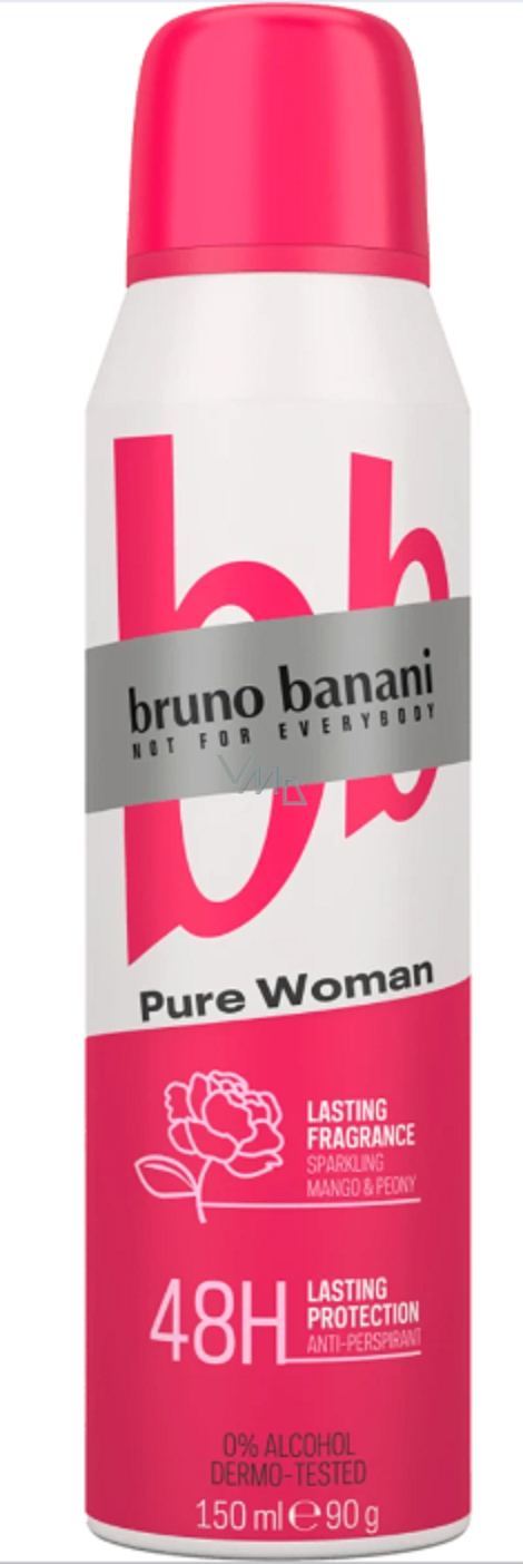 Dezodorant w sprayu Bruno Banani Pure Woman dzięki zastosowaniu wielu nut zapachowych i delikatniejszej koncentracji w nutach jest połączeniem doskonałej kombinacji subtelnego i świeżego aromatu z lekką wodną kompozycją. Kwiatowo-owocowa nuta dla kobiet otuli Cię tonami frezji, czarnej porzeczki i zielonej mandarynki. Serce składa się z cyklamenu, piwonii i mango. Podstawa nuty tworzona jest przez drewniane akordy, ambra i wanilia. Dodatkowo pomaga chronić przed potem i nieprzyjemnym zapachem aż przez 48 godzin. Ciesz się świeżym uczuciem komfortu przez cały dzień.