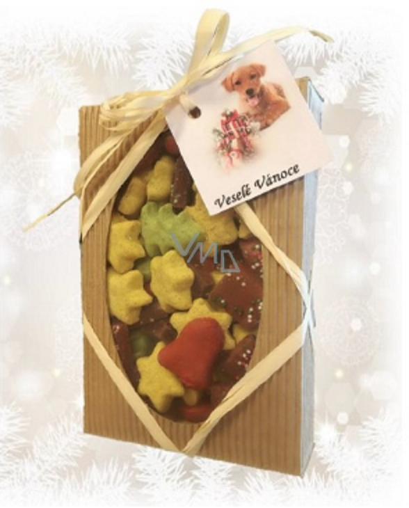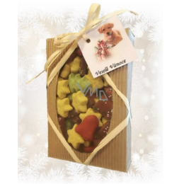 Vánoční krabička plná dobrot pro psy. S visačkou Veselé Vánoce.