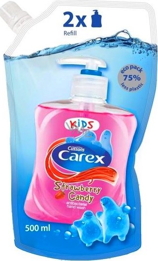 Například značka Carex nabízí celou tuto škálu ve vynikající kvalitě a navíc za průměrnou cenu. Carex Jahoda je určeno pro děti od 3 let, aby je ke správným hygienickým návykům motivovalo svou jahodovou vůní. Jako všechna antibakteriální tekutá mýdla Carex obsahují jemné, přirozeně antibakteriální složky kyseliny mléčné, které mají hydratační a protizánětlivé účinky, zklidňují podráždění a současně potlačují množení bakterií.