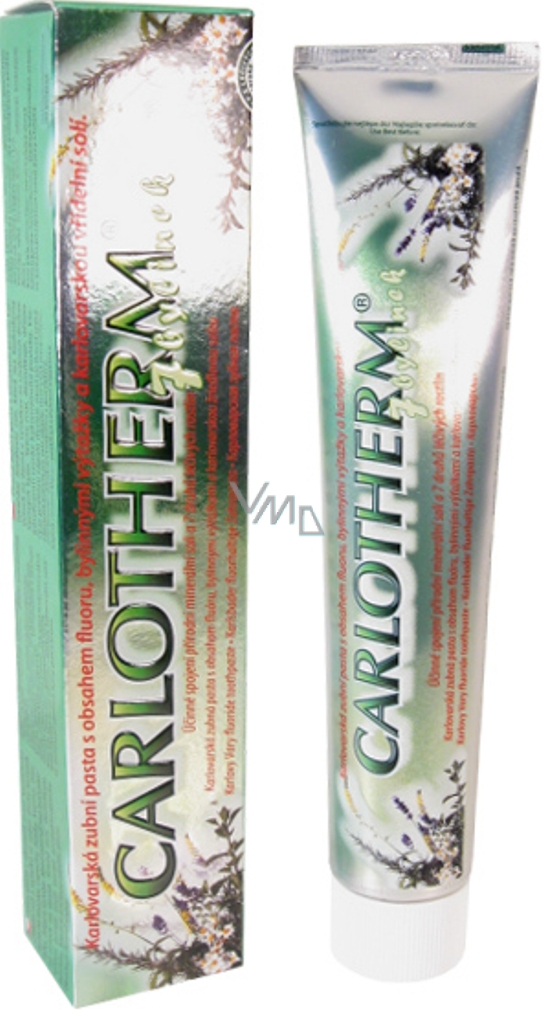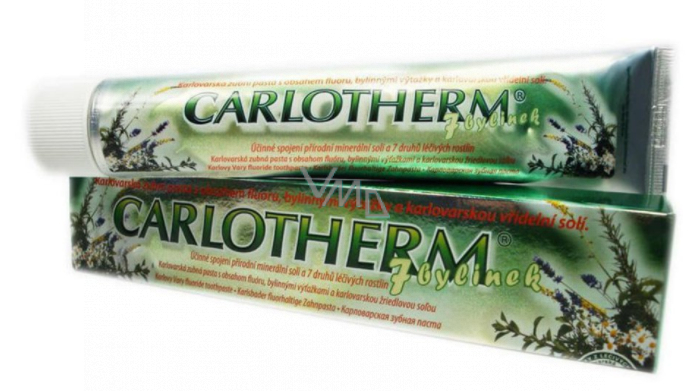 Karlovarska pasta do zębów zzawartością fluoru,ekstraktami ziołowymi orazsolą karlovarską. Skuteczne połączenienaturalnej soli mineralnej i7 rodzajów roślin leczniczych. Jest to preparat zawierający prawdziwą sól karlovarską, która ma dobroczynny wpływ na dziąsła i ekstrakt z siedmiu rodzajów ziołoleczniczych. Delikatnie czyści, dezynfekuje, skutecznie działa przeciwko powstawaniu bakteryjnego nalotu, który jest przyczyną zapalenia dziąseł. Zawiera fluor.
