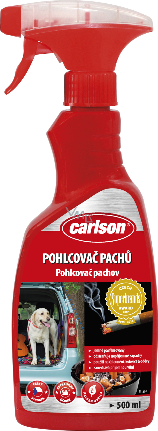 Carlson pochłaniacz zapachów usuwają nieprzyjemne zapachy z tapicerki samochodowej, tekstyliów domowych i odzieży. Usuwa zapachy takie jak np. dym papierosowy, pot, zapach zwierząt domowych i inne. Zostawia delikatny i przyjemny zapach.
