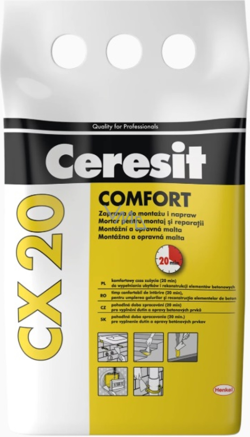 Ceresit CX 20 je rychletvrdnoucí montážní a opravná malta s prodlouženou dobou zpracování (20 minut), určená pro přesné kotvení a opravy v interiéru i exteriéru.