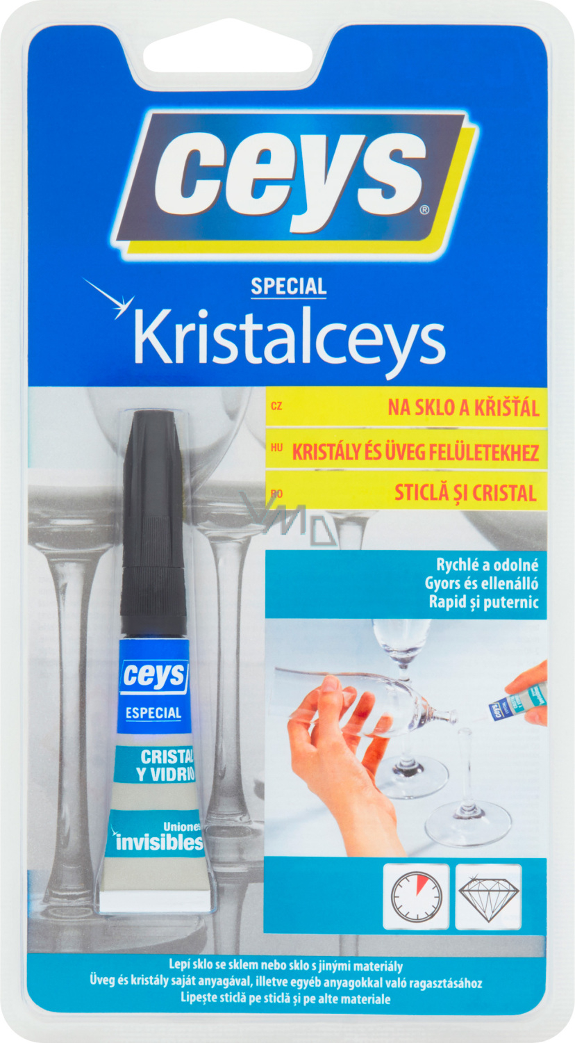 Kristalceys to szybki klej do łączenia szkła ze sobą lub z innymi twardymi materiałami. Klej bardzo szybko i niewidocznie za pomocą promieniowania słonecznego (ultrafioletowego). Odporność na wodę, środki czyszczące i temperatury do 70 °C. Nadaje się do klejenia płaskich powierzchni lub powierzchni, które idealnie do siebie pasują.