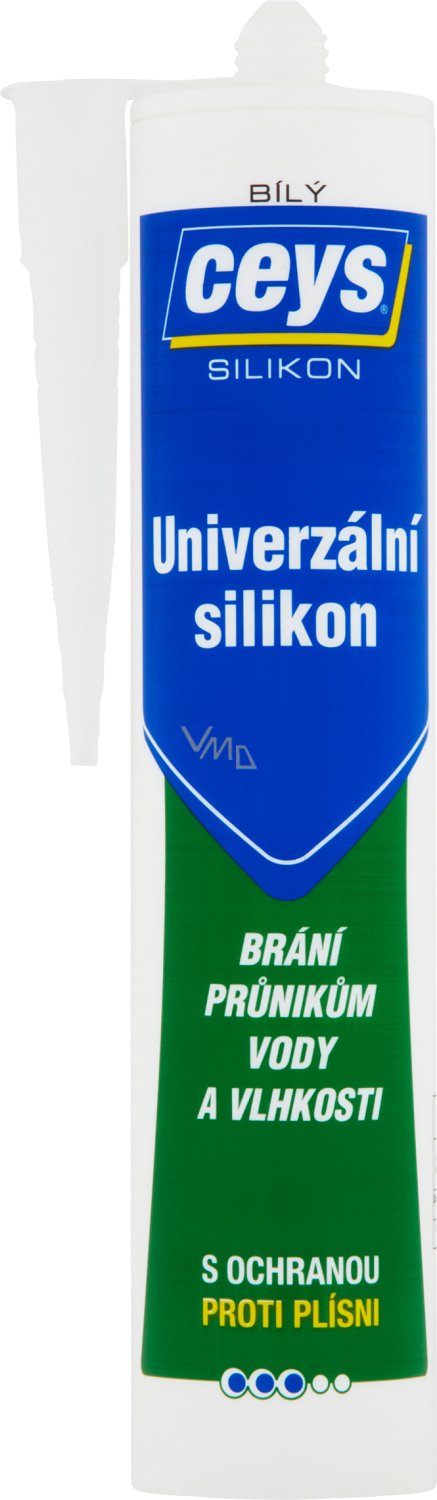Ceys Univerzální bílý silikon je těsnicí hmota z acetátového silikonu určená k dosažení celkové nepropustnosti a eliminaci průniků vody, vzduchu a vlhkosti. Obsahuje protiplísňové složky. Utěsňuje a vyplňuje praskliny a spáry a zdokonaluje celkový vzhled.