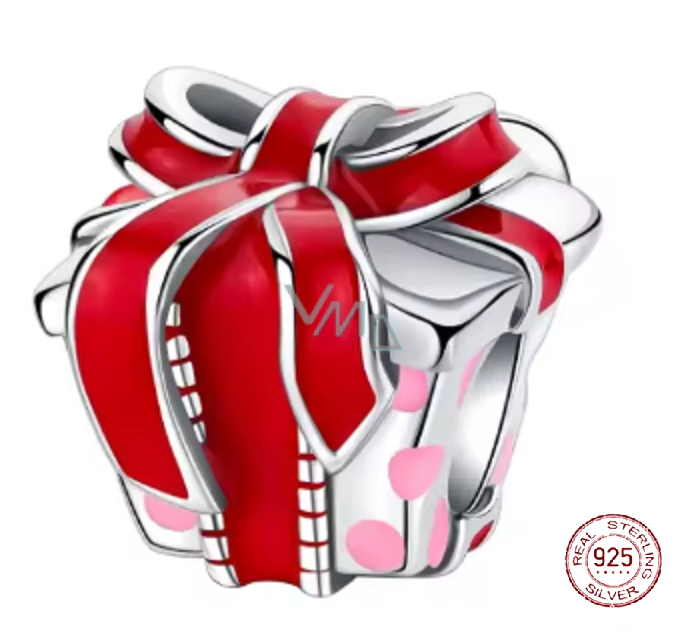Charm Sterlingové stříbro 925 Dárek s červenou stuhou, symbol radosti a lásky, korálek na náramek vánoce