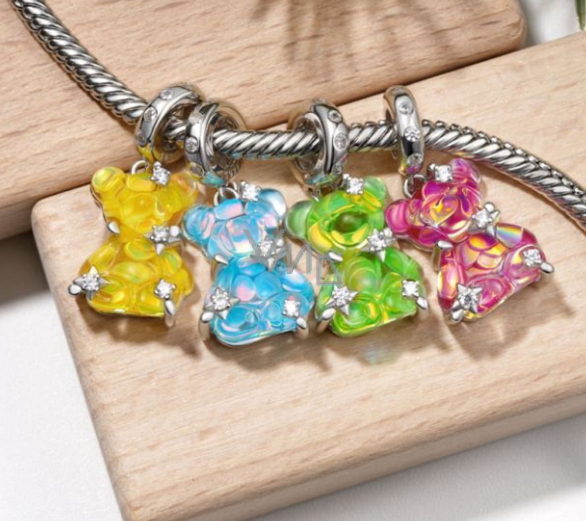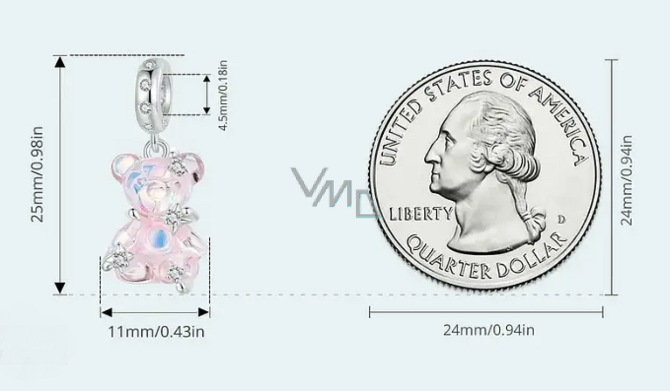 Błyszcząca powierzchnia i uroczy wygląd nadają Twojej bransoletce niepowtarzalny urok. Ta urocza zawieszka wykonana ze srebra próby 925 i żywicznej żywicy syntetycznej zawiera kolorowego gumowego niedźwiadka ozdobionego błyszczącymi srebrnymi gwiazdami pokrytymi kamieniami z cyrkonii, dodając odrobinę magii i elegancji. Oryginalny element ma urzekający design i spodoba się przede wszystkim kobietom.