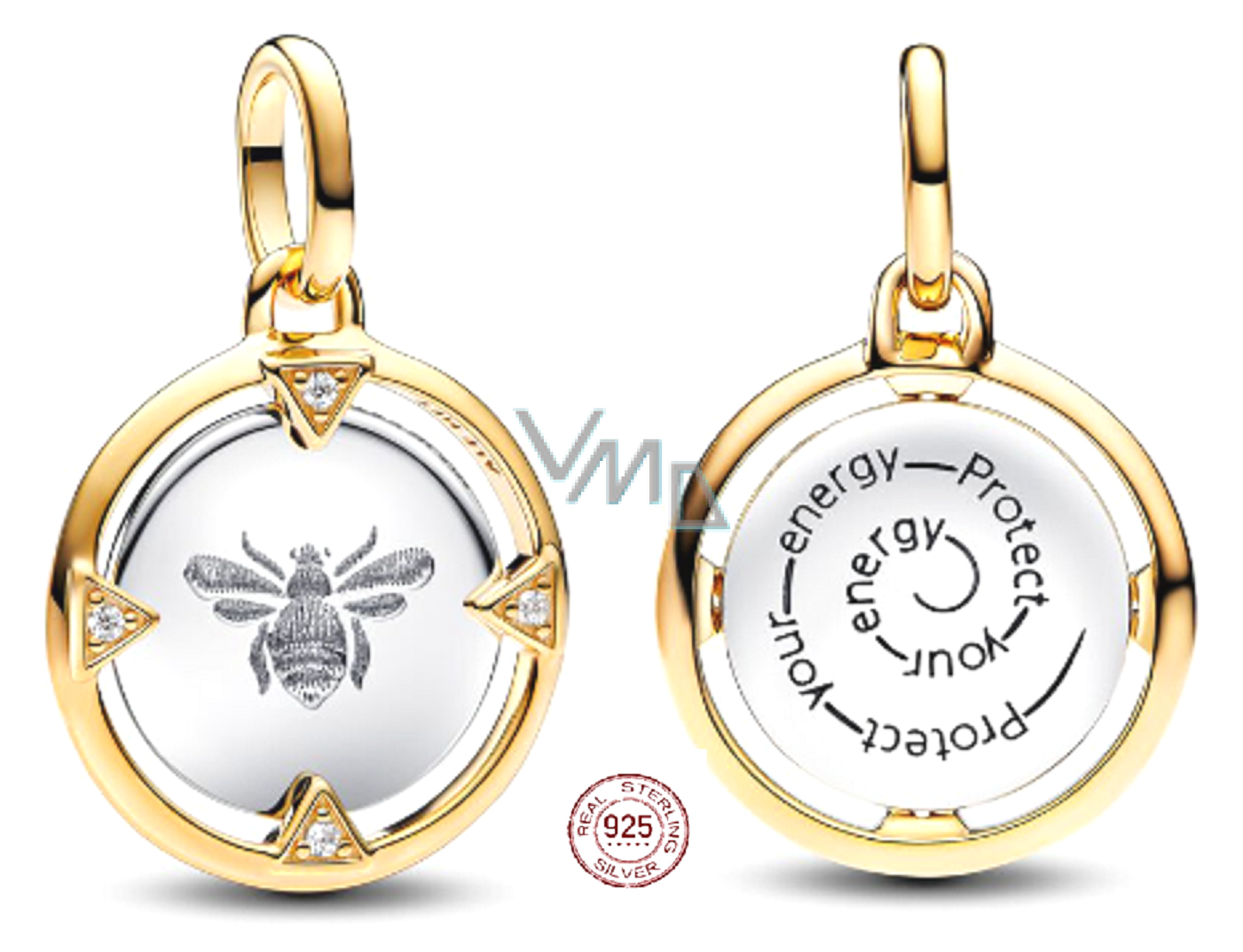 Wnieś do swojego życia pozytywną energię i produktywność z zawieszką medalionem delikatnie pozłacanym 14-karatowym złotem. Dwustronny urok zawiera medalion z nadrukiem z czterema trójkątnymi wskazówkami z błyszczącymi kamieniami po jednej stronie i wygrawerowanym przesłaniem „Protect your energy" - „Chroń swoją energię“ po drugiej stronie. Dodaj go do swojej kolekcji, aby symbolizować, że życie to przede wszystkim sensowna praca, pozytywność i równowaga.