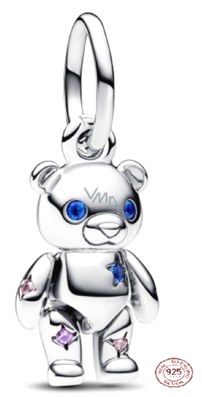 Charm Srebrny 925 Ruchomy miś z niebieskimi oczami, zawieszka na bransoletkę zwierzę