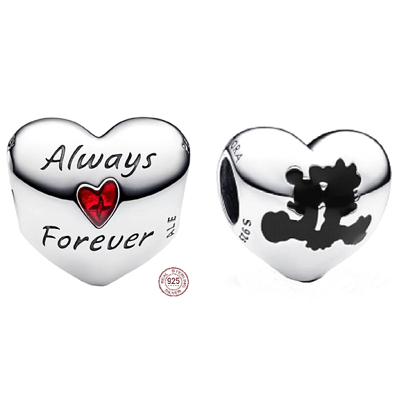 Miłość Mickey'ego i Minnie żyje w tym srebrnym czarze w kształcie serca z sylwetką ikonicznego duetu w czarnym emalii, siedzą z tyłu do siebie i trzymają się za ręce. Na drugiej stronie jest grawerunek „Always + Forever” i czerwone emaliowane serce z „+” widocznym przez emalię. Prezent pełen miłości dla specjalnego fana Disneya.