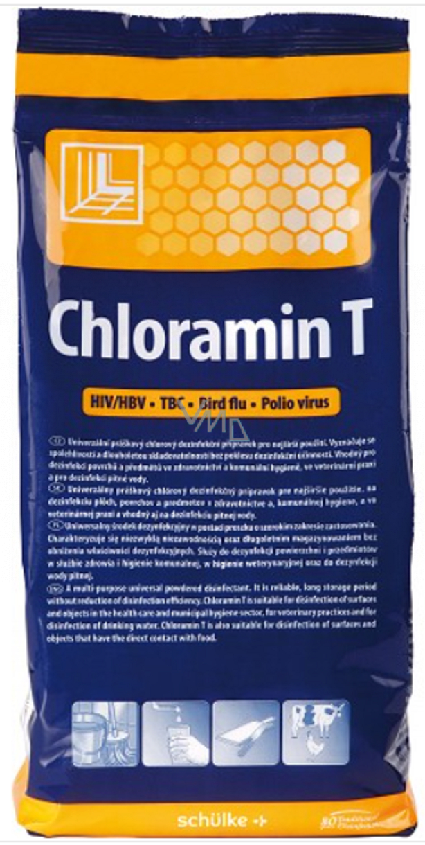 Chloramin T univerzální práškový chlorový dezinfekční přípravek pro nejširší použití. Vyznačuje se spolehlivostí a širokým spektrem dezinfekční účinnosti. Vhodný pro dezinfekci veškerých povrchů, ploch a předmětů odolných působení chloru ve zdravotnictví, potravinářství komunální hygieně, veterinární praxi a pro dezinfekci pitné vody.