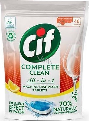 Tradiční značka CIF neustále inovuje a vylepšuje své produkty a snaží se najít lepší řešení pro naše životní prostředí a planetu. Nyní přichází s novými eko tabletami do myčky All in 1 Lemon 70% Naturally 46 ks. Tyto tablety odstraňují odolné skvrny, zajišťují zářivě čisté nádobí při každém umytí a zároveň splňují všechny požadavky pro Ecolabel. Obsahují 70 % přírodně odvozených složek a jsou vhodné i pro mytí v ekologických a krátkých cyklech. Dodávají se v plně recyklovatelném obalu. Balení CIF All in 1 Lemon 70% Naturally obsahuje 46 tablet se svěží citronovou vůní.