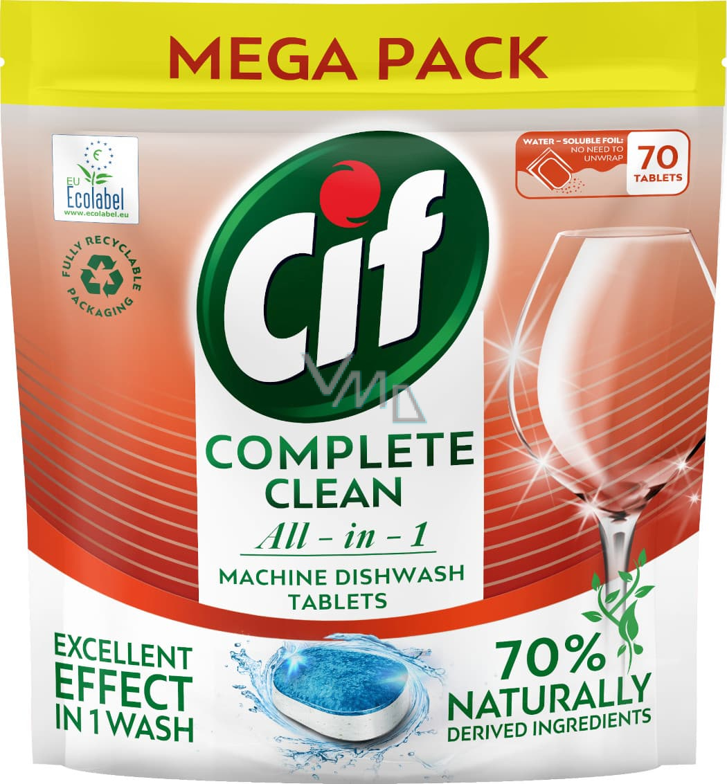 Tradiční značka CIF neustále inovuje a vylepšuje své produkty a snaží se najít lepší řešení pro naše životní prostředí a planetu. Tyto tablety odstraňují odolné skvrny, zajišťují zářivě čisté nádobí při každém umytí a zároveň splňují všechny požadavky pro Ecolabel. Obsahují 70 % přírodně odvozených složek a jsou vhodné i pro mytí v ekologických a krátkých cyklech. Dodávají se v plně recyklovatelném obalu a jedno balení CIF All in 1 Regular 70% Naturally obsahuje 70 tablet.
