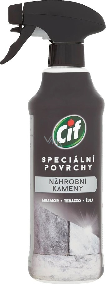 CIF přináší řešení pro speciální povrchy, náhrobní kameny, v podobě čisticího spreje. CIF Náhrobní kámen vyčistí pomníky a náhrobky ze žuly, terazza i mramoru. Přípravek likviduje nečistoty šetrně. Na površích nezanechává škrábance ani jiná poškození. Odstraňuje usazeniny způsobené srážkami, nečistoty vzniklé aktivitou flóry (mech), ptačí výkaly, prach aj. Přípravek lze použít i na bílý leštěný mramor. Neobsahuje bělidla, nezanechá na náhrobcích nepříjemné skvrny. Přípravek je vhodný i k čištění písma na náhrobcích. Nečistoty odstraňuje do 1 minuty. Cif je zárukou kvality, na trhu úspěšně působí již přes půl století.