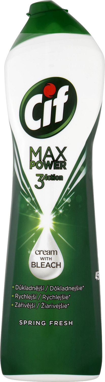 Cif MaxPower Spring Fresh środek czyszczący ma moc wybielacza i zapewnia doskonałe wyniki czyszczenia. Dzięki formule z dodatkiem środka wybielającego zapewnia "potrójne rozwiązanie" - dokładniejsze, szybsze i jaśniejszeczyszczenie.