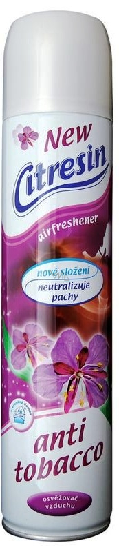 Osvěžovač vzduchu Citresin Anti Tobacco s novou formulací. Polhcovač pachů spolehlivě neutralizuje zápach z cigaretového dýmu a zanechá příjemnou vůni ve Vaší domácnosti.