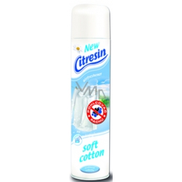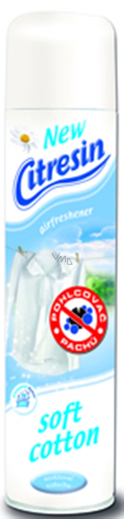 Citresin Soft Cotton je osvěžovač vzduchu s jedinečnou formulací obsahující pohlcovač pachů. Nepříjemné pachy v domácnosti proto účinně odstraňuje, nejenom překrývá. Příjemná vůně čistého prádla usušeného na letním slunci vytvoří ve Vašem domově pocit svěžesti a čistoty.