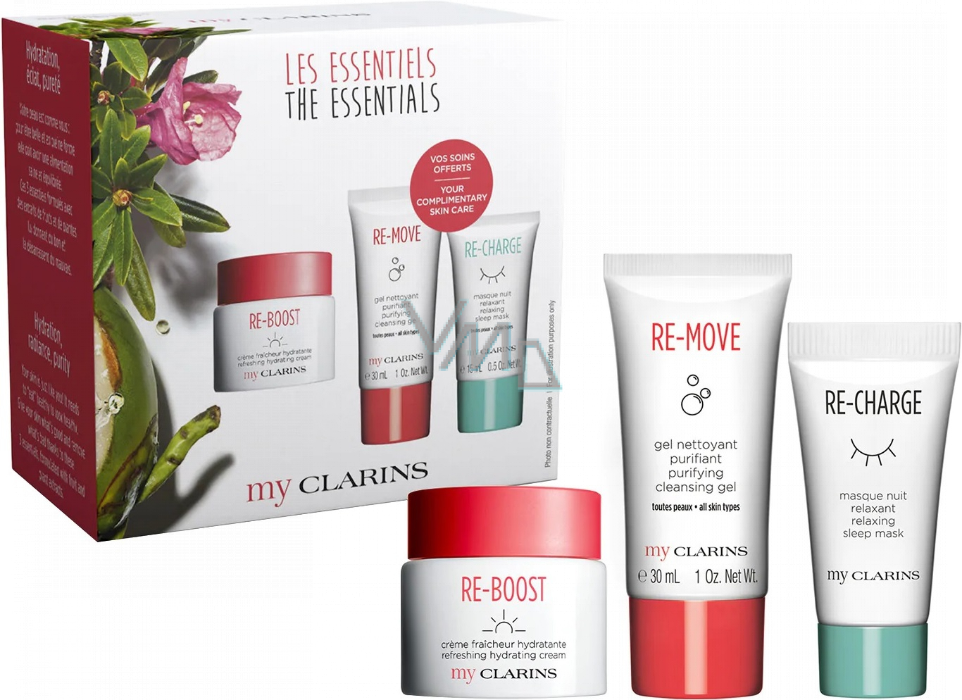 Clarins MyClarins Loyalty VP Re-Boost hydratační krém 50 ml + Re-Move čisticí gel 30 ml + Re-Charge relaxační noční maska 15 ml, kosmetická sada