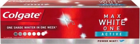 O jeden odstín bělejší už za 1 týden. Účinné odstraňování skvrn. Colgate zubní pasta Max White One s aktivátory bělení obsahuje složky používané zubními lékaři. Odstraňuje zabarvení a předchází usazování zubního kamene s cílem dosažení bělejších zubů o 1 odstín za 1 týden. S Fluorem.