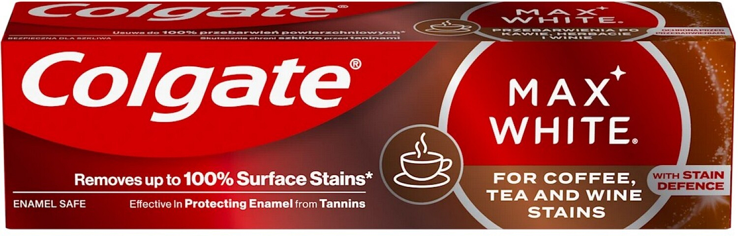 Colgate Max White One Coffee, Tea & Wine pasta do zębów jest odpowiednia do codziennej pielęgnacji zębów, koncentrując się na usuwaniu plam spowodowanych kawą, herbatą i winem. Pomaga utrzymać zęby w czystości i przyczynia się do ich jaśniejszego wyglądu.