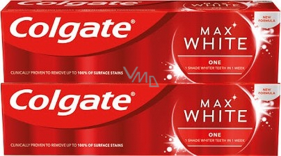 Zubní pasta Colgate Max White One obsahuje aktivátory bělení, které ze zubů odstraňují zabarvení a brání vzniku a usazování zubního kamene. Každodenním používáním pasty lze za týden dosáhnout bělejších zubů o 1 odstín. Složení s fluoridem navíc posiluje zubní sklovinu a chrání zuby před vznikem zubního kazu.